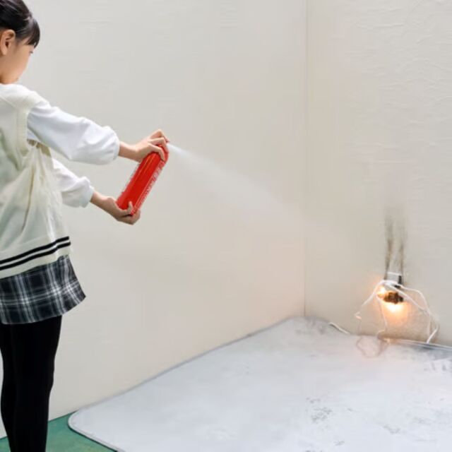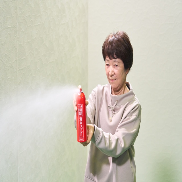 消火器は、仕組みや操作手順を理解していないと噴射できない可能性がありますが、FIRE OUTは殺虫剤やヘアスプレーと同じ使い方で、初期消火が可能です(キャップを外して、火元に向けてボタンを押すだけ)。