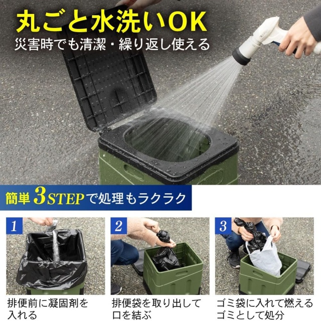 耐荷重100kgの頑丈な構造で、体格の大きな方でも安定して使用可能。非常時のストレスを軽減できる非常用トイレです。 - 【丸洗いOKで衛生的・マルチに使える設計】