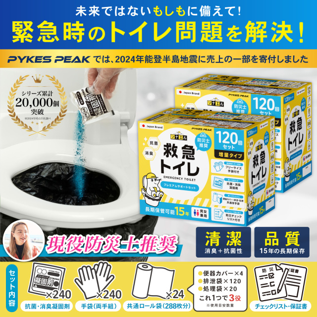 - 救急トイレ240回分と、折り畳みできる防災トイレのe!マルシェ限定セットです。