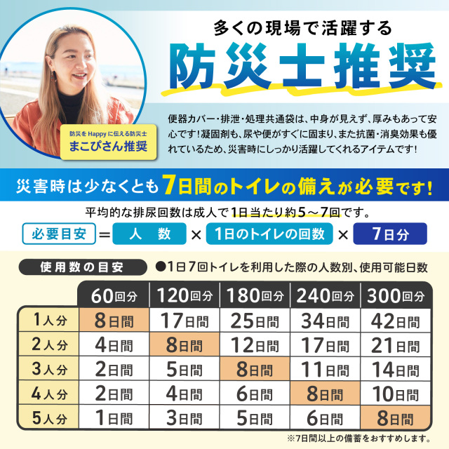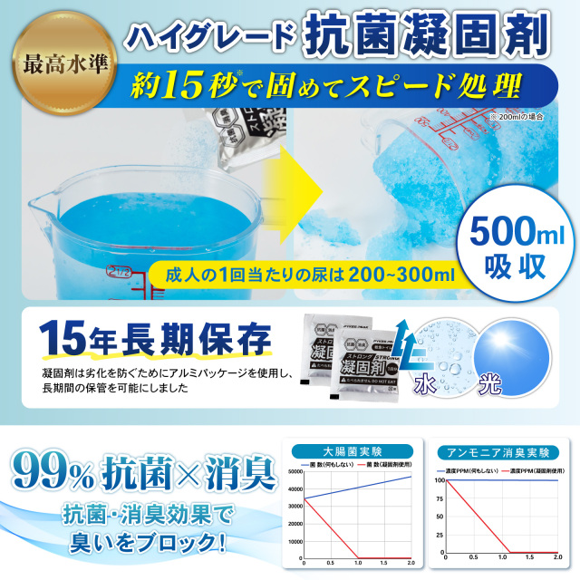 現役防災士の方からもご好評いただいており、大切なご家族を守るための備えとして、非常時に役立ちます。 - 【 抗菌・吸水・消臭性を兼ね備えた高性能凝固剤を採用! 】